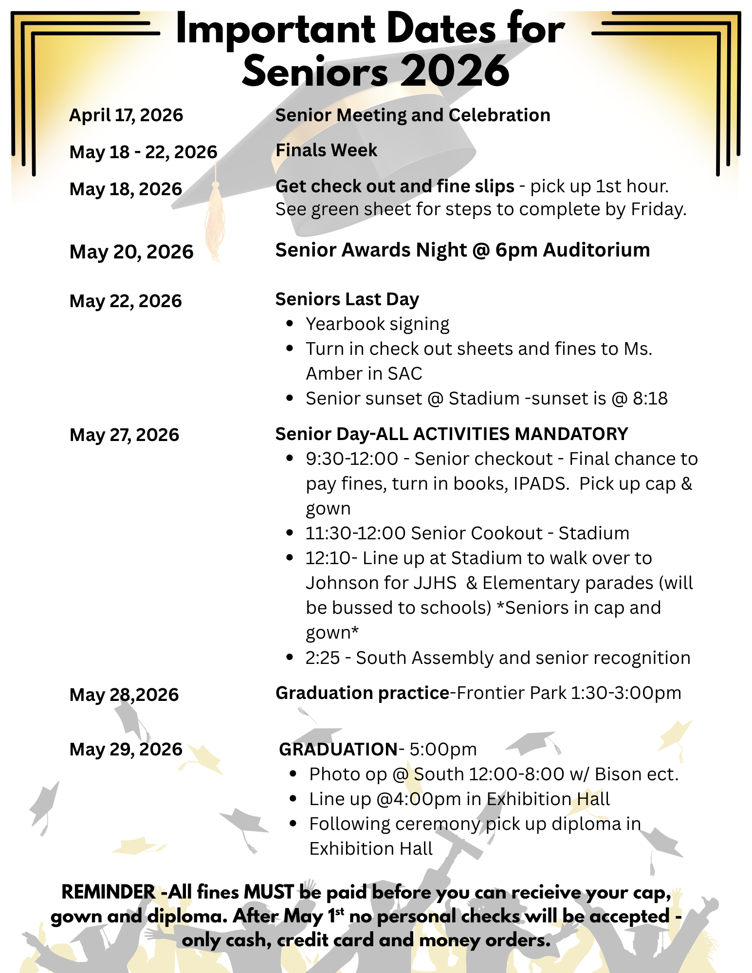 **Senior Meeting and Celebration- Friday, April 17, 2026 @ 9:00 am ****Senior speaker tryouts April 29, 2026 - Please come to the SAC and talk with Mrs. DeMartin if interested in trying out***Cap/G...